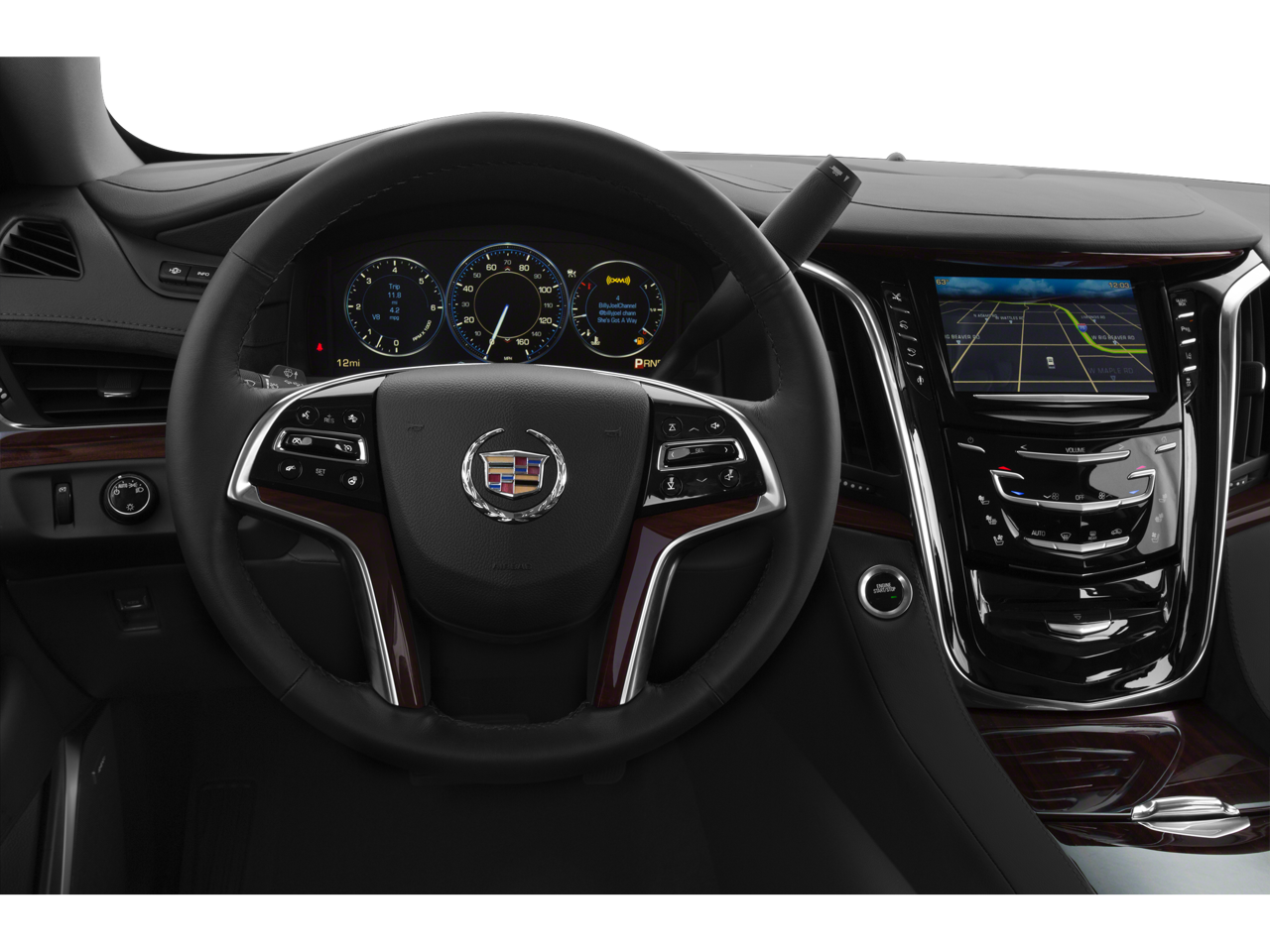 CADILLAC CUE INFORMATION AND MEDIA CONTROL SYSTEM WITH EMBEDDED NAVIGATION AM/FM stereo, 8" diagonal color information display featuring touch response, haptic feedback, gesture recognition and Natural Voice Recognition. Five USB ports, including one in the articulating storage door/bin, SD card slot and auxiliary audio port (STD), ENGINE, 6.2L V8 WITH ACTIVE FUEL MANAGEMENT Spark Ignition Direct Injection (SIDI) and Variable Valve Timing (VVT), includes aluminum block construction (420 hp [313.2 kW] @ 5600 rpm, 460 lb-ft of torque [621 N-m] @ 4100 rpm) (STD), TRANSMISSION, 8-SPEED AUTOMATIC, 8L90 (STD). Cadillac Luxury with Silver Coast Metallic exterior and Kona Brown w/Jet Black Accents interior features a 8 Cylinder Engine with 420 HP at 5600 RPM*.