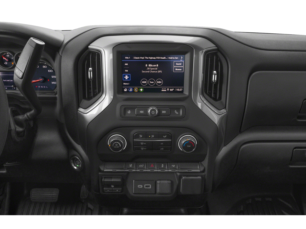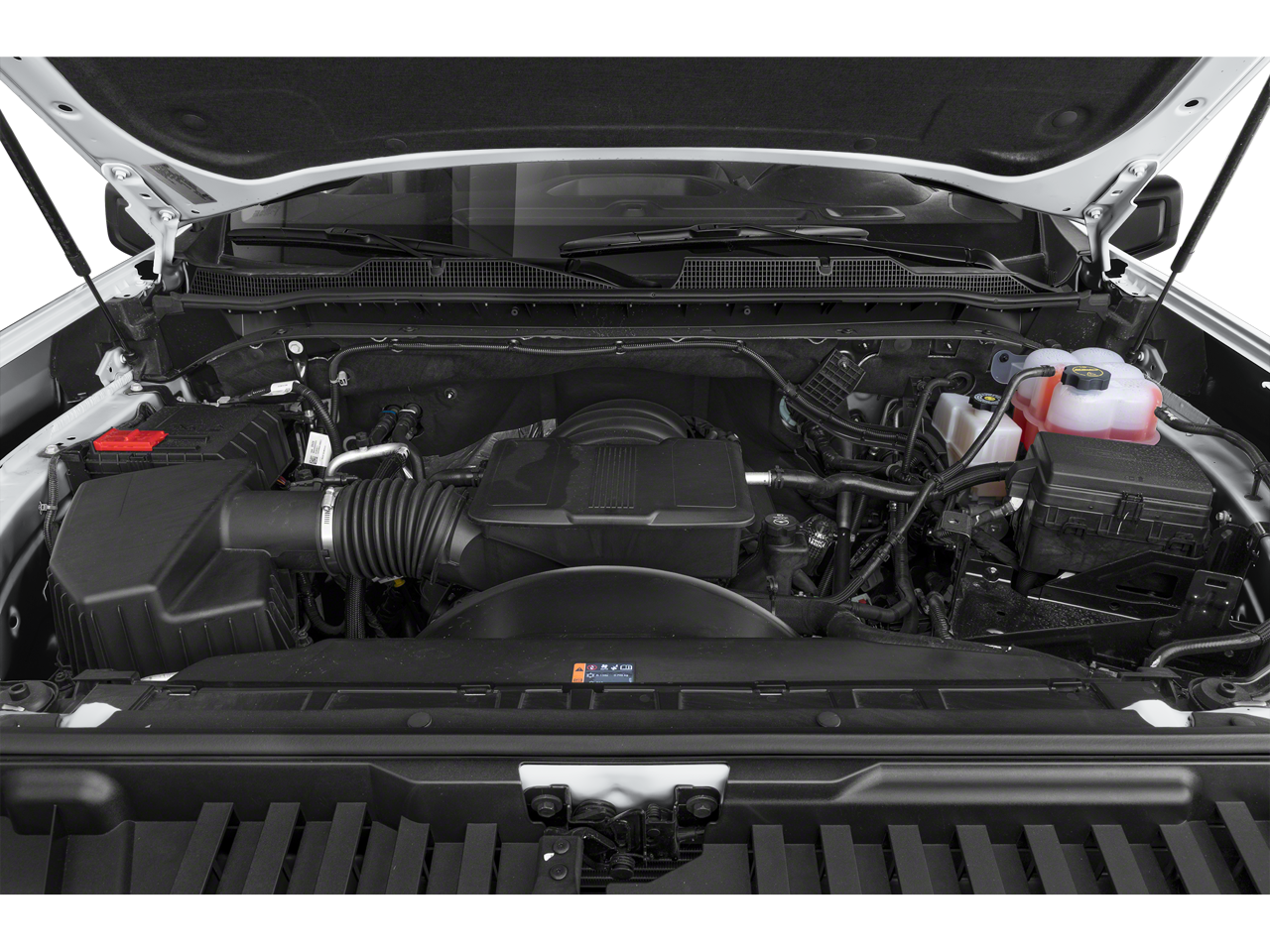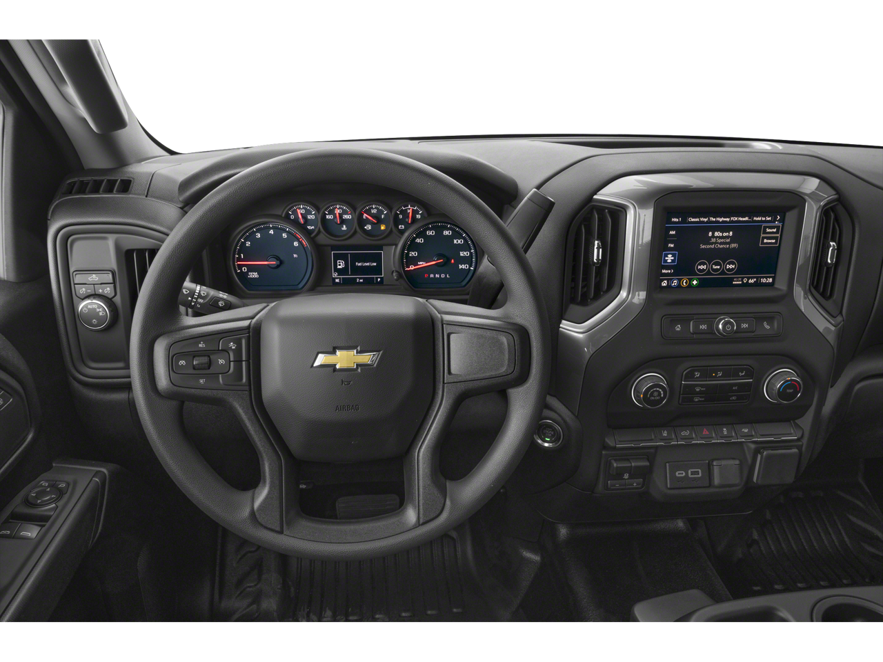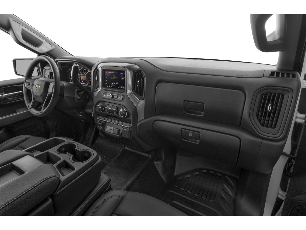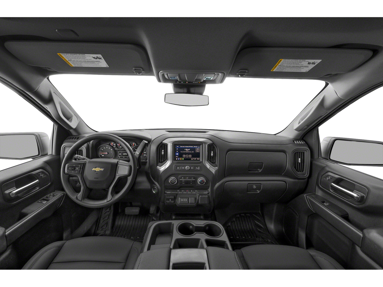 MIRRORS, OUTSIDE POWER-ADJUSTABLE VERTICAL TRAILERING WITH HEATED AND AUTO-DIMMING UPPER GLASS lower convex mirrors, turn signal indicators, puddle lamps, (U12) perimeter lighting, auxiliary lighting, power folding/manual extending (extends 3.31" [84.25mm]) Includes (DD8) auto-dimming rearview mirror. WHEELS, 18" (45.7 CM) PAINTED STEEL, GLASS, DEEP-TINTED, AUDIO SYSTEM, CHEVROLET INFOTAINMENT 3 SYSTEM 7" diagonal HD color touchscreen, AM/FM stereo, Bluetooth® audio streaming for 2 active devices, voice command pass-through to phone, Wireless Apple CarPlay and Wireless Android Auto compatibility (STD), ENGINE, 6.6L V8 with Direct Injection and Variable Valve Timing, gasoline, (401 hp [299 kW] @ 5200 rpm, 464 lb-ft of torque [629 N-m] @ 4000 rpm) (STD), TRANSMISSION, 10-SPEED AUTOMATIC (STD). Chevrolet Work Truck with Black exterior and Jet Black interior features a 8 Cylinder Engine with 401 HP at 5200 RPM*.